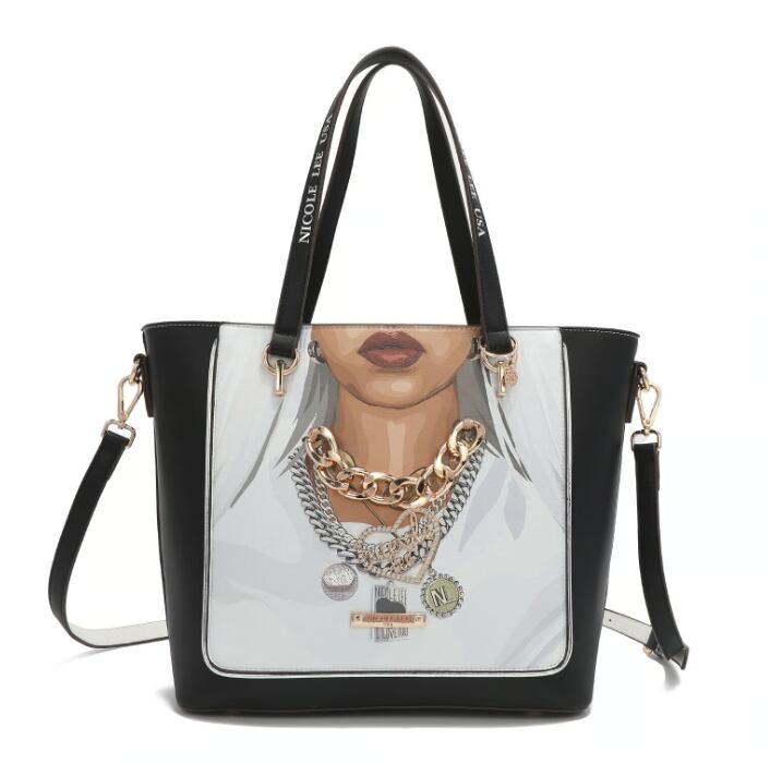 Goddess of Love チェーン トートバッグなら日常にエレガンスが簡単に手に入ります。クラシックなフォルムのトートバッグにはエッジの効いたゴールドトーンのアクセサリーと持ち手のnicoleleeロゴが、より一層上品に、華やかに、コーディネートを引き立てます。