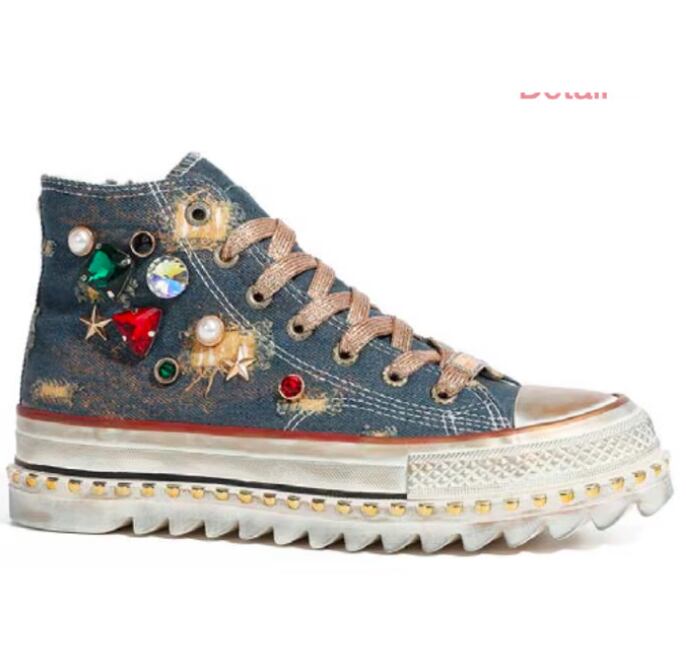 ほど良いヴィンテージ&ダメージ感がこなれ感を演出するデニム地ハイカット厚底スニーカー。