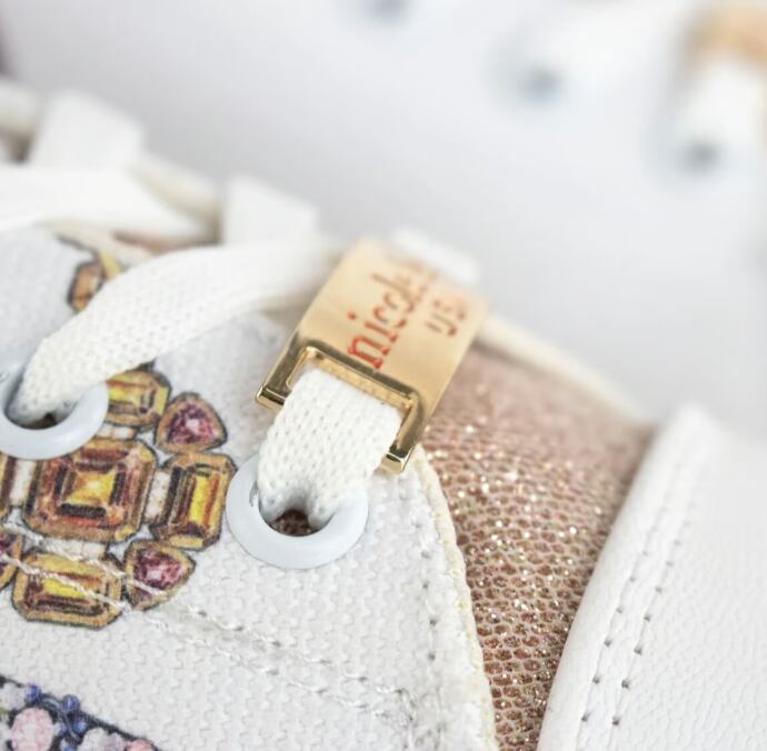 クラシックなスニーカーをnicoleleeが再定義したホワイトデニムのモダンなスニーカーです。約3㎝のプラットフォームソールとキラキラ輝く装飾が目を引く人気シリーズ。