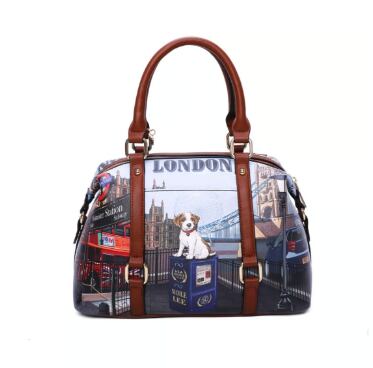ロンドン風景に描かれたワンちゃんとニコルリーガールがお洒落なデザインです。